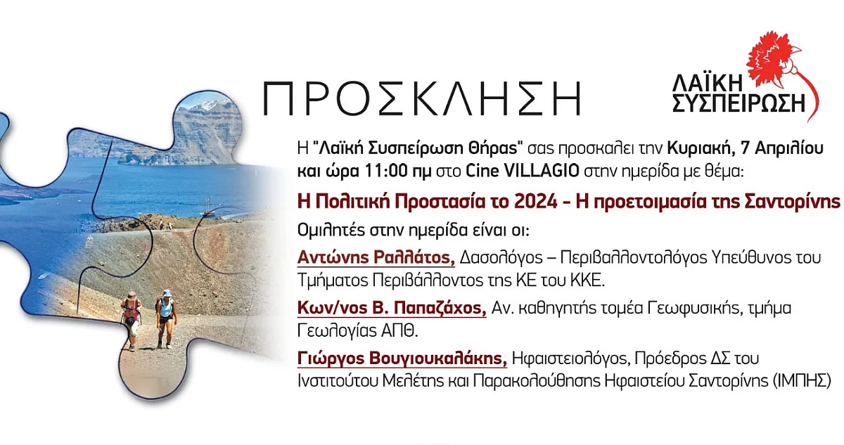 Η Λαϊκή Συσπείρωση Θήρας διοργανώνει ημερίδα με θέμα “Πολιτική Προστασία το 2024: Η προετοιμασία της Σαντορίνης“.